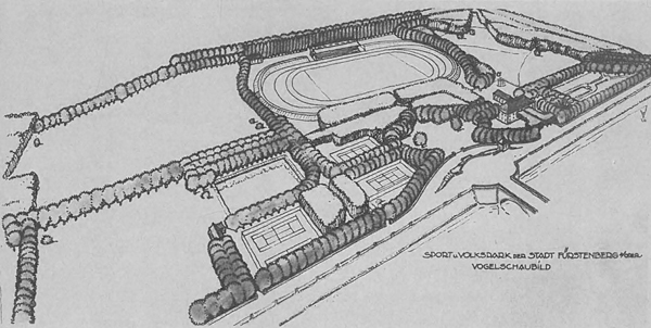 Sportpark der Stadt Fürstenberg an der Oder, entworfen und ausgeführt von der Abteilung Gartengestaltung der Baumschule L. Späth, 1920er Jahre