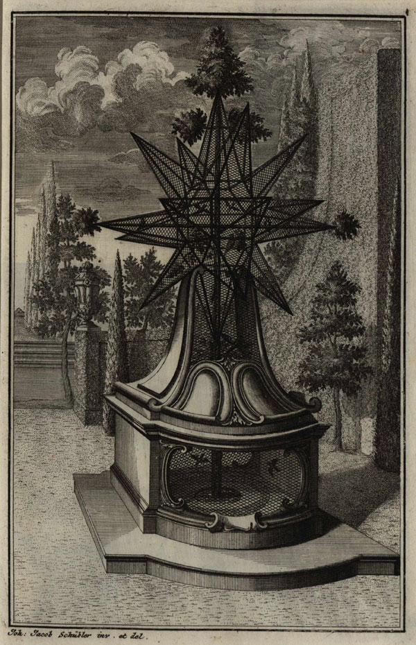 [Abbildung: Schübler Johann Jacob : Perspektivische Belustigung und neue Versuche von kleinen Lusthäusern, wie auch allerhand künstlichen Vogel-Bauern [...] / Récréations perspectives et essais des nouveaux cabinets des berceaus, cages, ou volières artificielles, Nürnberg: Weigel, o.J., Taf. 12]