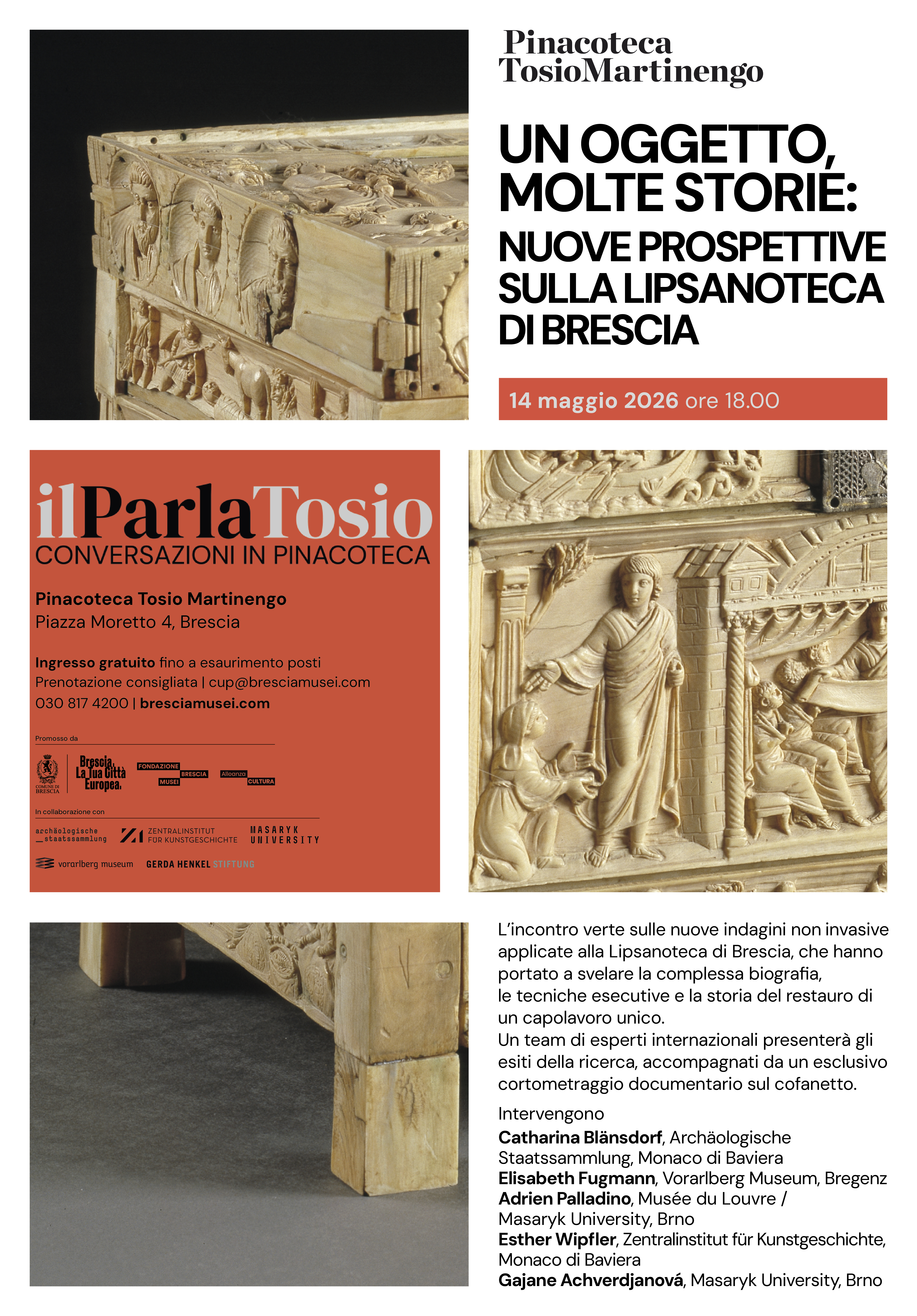 Im Mittelpunkt der Veranstaltung stehen die neuen nicht-invasiven Untersuchungsmethoden, die an der Lipsanothek in Brescia angewandt wurden und die Entdeckung der komplexen Entstehungsgeschichte, der Ausführungstechniken und der Restaurierungsgeschichte dieses einzigartigen Meisterwerks ermöglichten. Ein Team internationaler Experten wird die Forschungsergebnisse vorstellen, begleitet von einem exklusiven Dokumentarkurzfilm über das Kästchen.