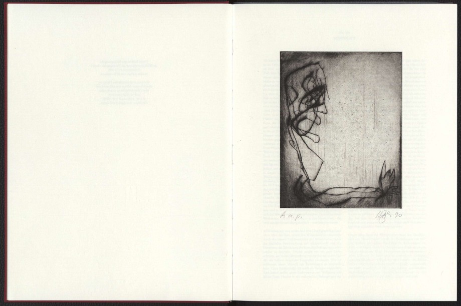 Vorzugsausgabe mit einer Originalradierung in einer Auflage von insgesamt 20 Exemplaren. Von zwei unterschiedlichen Platten ist jeweils in einer Auflage von 10 Exemplaren eine signierte und datierte Kaltnadelradierung eingebunden (Nummerierung A 1/10-10/10, B 1/10-10/10). Druck der Radierungen der Vorzugsausgabe durch D. P. Druck- und Publikations GmbH, Karl Imhof, München. Das vorliegende Exemplar mit Artist proof der Radierung A.