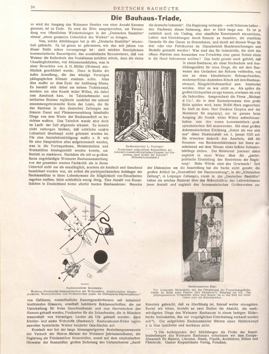 Polemischer Artikel zur Vertreibung des Bauhauses in Weimar („Die Bauhaus-Triade“, in: Deutsche Bauhütte, H. 2, 29. Jg. (1925), S. 24