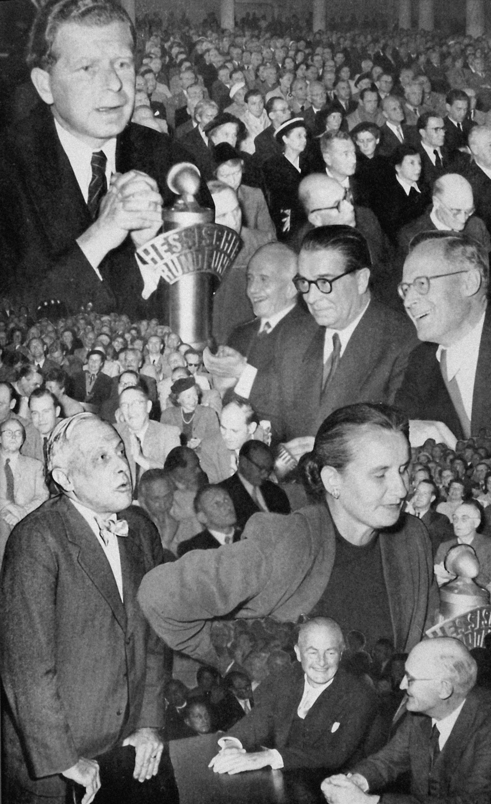 Juliane Roh (unten rechts) in einer Collage zum 3. Darmstädter Gespräch „Mensch und Technik“, 1952. Fotograf: Pit Ludwig, pbs-Pressebildstudio; Collage: Erich Roether. Reproduktion aus: Schwippert, Hans (Hg.): Mensch und Technik: Erzeugnis – Form – Geb...