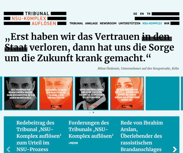 Sie sind hier: Startseite / Forschung / Projekte / Projekte der Fellows / Images / Screenshot: Tribunal NSU-Komplex auflösen, https://www.nsu-tribunal.de/nsu-komplex/#newsmodal (Zugriff: 7.4.2022)